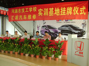 10月26日上午,河源市技工學(xué)校匯源汽車銷售公司實(shí)訓(xùn)基地掛牌儀式在匯源汽車銷售公司舉行。河源市技工學(xué)校100多名師生、匯源汽車銷售公司部分員工參加了掛牌儀式。市委常委、市政府副市長(zhǎng)楊耀初同志,市政府邱榮輝副秘書(shū)長(zhǎng),及市勞動(dòng)保障局等部門(mén)領(lǐng)導(dǎo)出席了掛牌儀式。掛牌儀式由市勞動(dòng)保障局歐繼勝副局長(zhǎng)主持,匯源集團(tuán)賴運(yùn)宏董事長(zhǎng)在掛牌儀式上致詞,市技工學(xué)校歐陽(yáng)仕文校長(zhǎng)發(fā)表講話。最后,楊耀初副市長(zhǎng)作了重要講話。楊副市長(zhǎng)充分肯定了匯源汽車銷售公司與市技工學(xué)校的合作,高度贊揚(yáng)了匯源汽車銷售公司勇?lián)鐣?huì)責(zé)任、充滿愛(ài)心的企業(yè)精神;希望校企繼續(xù)努力,更快、更好地為社會(huì)培養(yǎng)更多、更優(yōu)的有用人才!