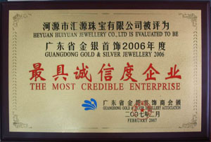 匯源珠寶公司榮獲廣東省金銀首飾最具誠信度企業(yè)稱號