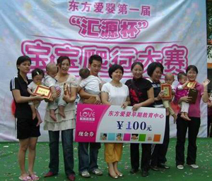 由匯源集團獨家贊助的、東方愛嬰早教中心主辦的“匯源杯”寶寶爬行大賽于2008年11月2日上午在廣晟廣場舉行。此次活動報名踴躍,共有108名出生5個月至12個月的寶寶報名參賽。賽場熱鬧非凡,笑聲掌聲不斷,吸引了不少未報名參賽寶寶的家長前來觀看,普遍稱贊活動有特色,能讓小寶寶增長見識,最主要的是能加深親子關系,喚起家長們重視早教的意識。經(jīng)過分組賽、決賽,最終決出一等獎3名、二等獎6名、三等獎9名。